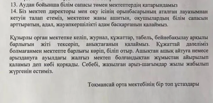Тексеру кезінде директордың педагогикалық әдеп талаптарын сақтамағаны, мұғалімдер арасындағы жүктемені дұрыс бөлмегені, сонымен бірге мектеп асханасында тыйым салынған өнімді сатқаны белгілі болды. Бұзушылықтар анықталған соң мектеп директоры А.Қарасаева биыл 8-сәуір күні жұмыстан босатылды,- деп хабарлады Ақтөбе облыстық білім басқармасының баспасөз қызметі.
